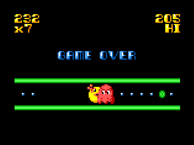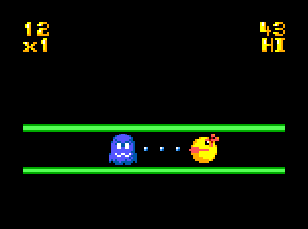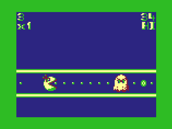 Just as in Paku Paku, your aim is to munch as many dots... and ghosts!... as you can on a one-dimensional playing field. The only control is the joystick button: press it to reverse Ms Paku's direction.