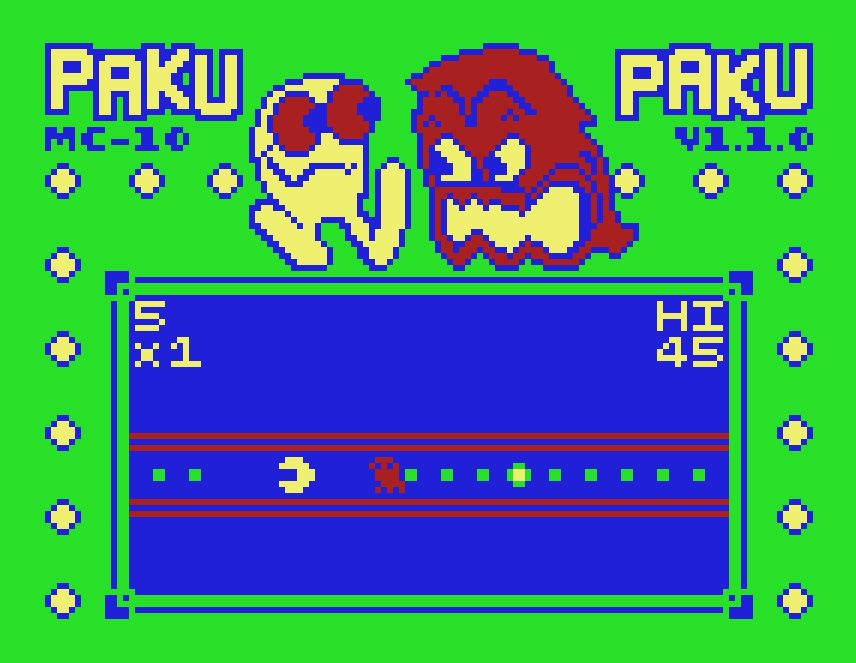 Paku Paku was written in 6809/6803 assembly language. The CoCo version requires a joystick (button) to play. The MC-10 version uses the spacebar.